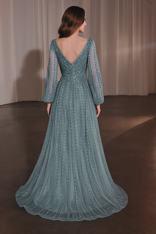 SARA - VESTIDO DE FIESTA AZUL CON MANGAS Y ESCOTE EN V