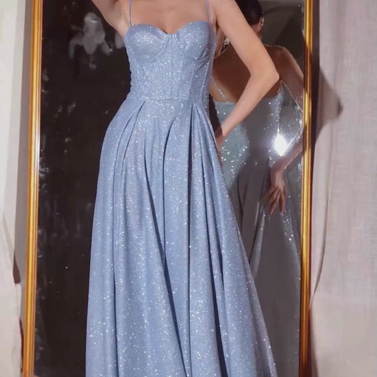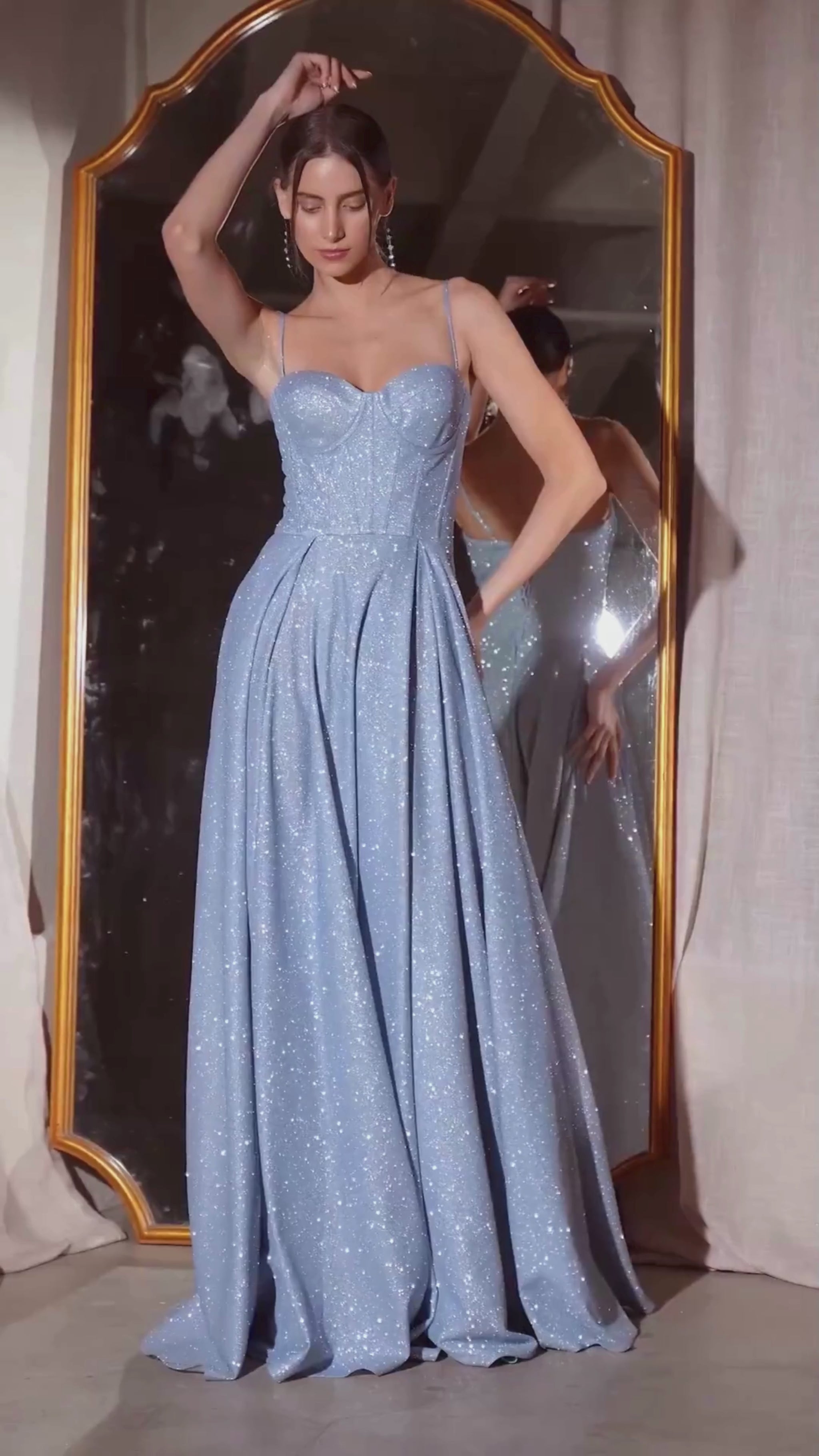 Este vestido en tono azul claro con acabado brillante es una pieza diseñada para quienes desean proyectar elegancia etérea y un encanto de cuento. Su corset estructurado con costuras visibles enmarca el busto con forma corazón y estiliza el torso, mientras los tirantes delgados aportan ligereza y feminidad.