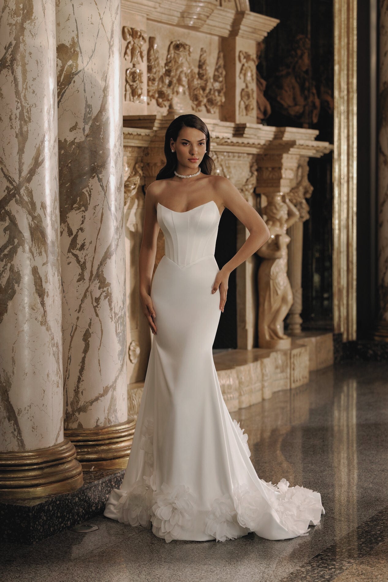 Este diseño es perfecto para bodas elegantes y sofisticadas —ya sea en salones clásicos, locaciones históricas o espacios con arquitectura imponente. También resulta ideal para ceremonias nocturnas o recepciones formales donde el glamour y la silueta sean protagonistas.